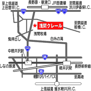 上信越自動車道碓氷軽井沢インターより国道18号線。中軽井沢駅より国道146号線沿い。浅間牧場信号より1.4km右側。 関越自動車道渋川伊香保インターより草津、吾妻方面へ。国道353号線から国道145号線へ。羽根尾信号左折、国道146号線沿い。北軽井沢信号より1.2km左側。