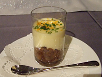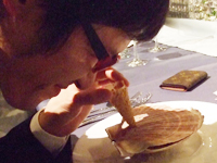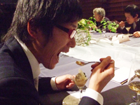 ◆帆立貝のマリニエール 松本一本葱のコンポートと黒トリュフの香りを添えて+◆ソラリス 信州小諸シャルドネ 樽仕込み 2007 まな隊員:「貝ひものソースを注いで少し中身を閉じ込めるんですって。」 HIRO隊員: 「そろそろ貝を開けて。おぉ、ひと口スープを飲むと僕の体が次のひと口を欲しているのを感じる!うまい!」 |