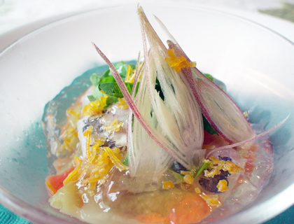 コンソメジュレの中のオレンジ色のものが・・・スープ状にしたトマトですか!さっぱり爽やかで、前菜から食欲増進されちゃう感じっ!アジも茄子も冷たく柔らか~♪