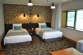 軽井沢プリンスホテルイーストの客室。森をテーマに内装を新たにした。 軽井沢マリオットホテルの客室棟