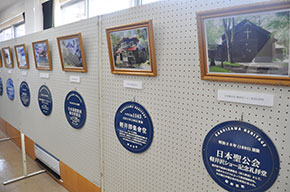 認定を受けた建物に掲げられる銘板ブルー・プラーク。 軽井沢町と信州大学、同大学社会基盤研究センター、