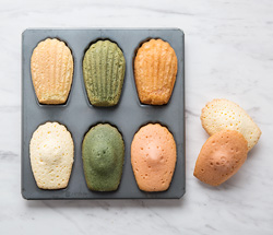 フランボワーズとバラ(ピンク)・よもぎ(みどり)・蜂蜜(黄色)のバターたっぷりのあつあつマドレーヌ。焼き上がりは毎日19時。1個162円