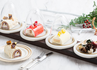 「ザ・ラウンジ」の目の前に広がるのは、凛とした空気が漂う冬の風景。クリスマスのデザートコースは、特別に四品のコース仕立てで楽しめます。パティシエの想いが込められた新しいデザートコースには美味しい驚きがたくさん詰まっています。