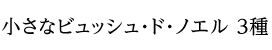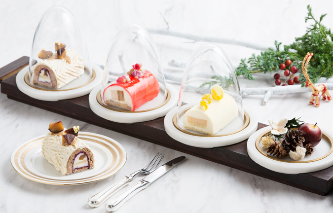 薪の形を模したビュッシュ・ド・ノエルを、3種類の小さなガトーに仕立てました。栗とやまぶどう、りんごとくるみ、ゆずとホワイトチョコレートの思いがけない組み合わせが楽しい。
