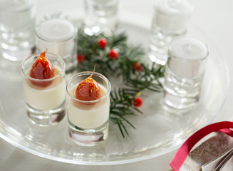 一品目は「りんごのコンポート」。赤色をした温かなりんごのコンポ―トは、雪に見立てたパウダーに包まれ、その下には、りんごのピューレと胡桃入りのクッキー生地が敷かれています。