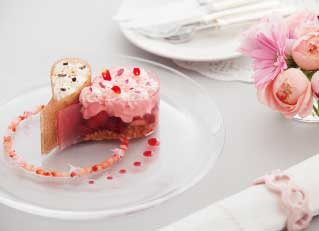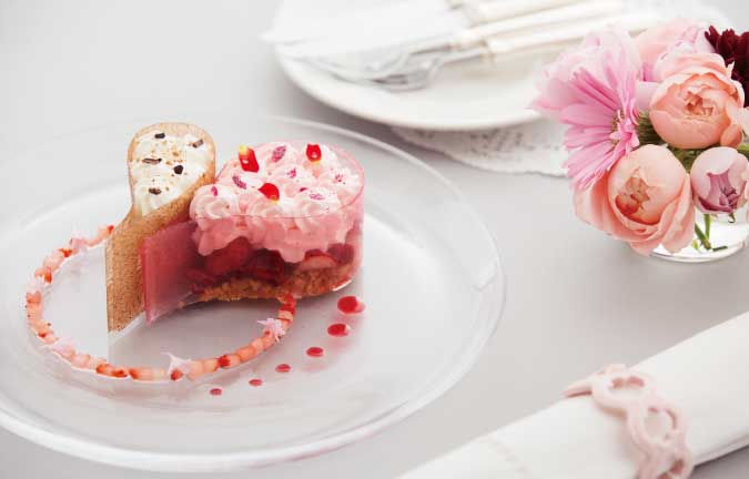 二品目目のメインの一皿は「クープ・ド・クール」(ひとめぼれ)。可愛らしいハートのカタチを表しています。左側はカカオ風味のエスプーマにショコラのムース、右側はベリーのコンポートと苺のクリーム。2人でシェアをしながらいただきます。