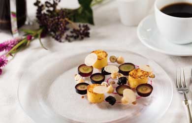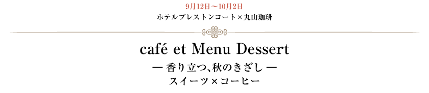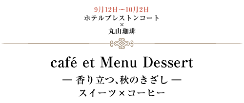 3品のコース仕立てでスイーツが楽しめる「ムニュ・デセール」秋は互いに香りや味を高めあう組み合わせとして用いられる’ペアリング’をスイーツと珈琲で体験。パン・オ・レザンに見立てたメインのスイーツ「遠足」では、酸味が特徴の珈琲「ケニア・ガチャタ」を合わせて。