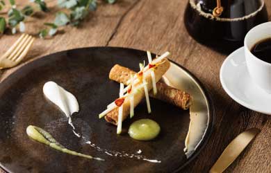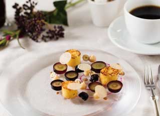 香りを放つ洋ナシのエスプーマに、サクサクの食感の梨の果実とほうじ茶が香る’クレマカタラーナ’。ほろ苦いカラメルの食感にひんやりと冷たい、秋風を感じる一品。