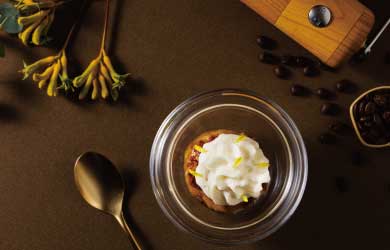洋ナシの香りを引き立たせる”コロンビア・ロベルト・チクエ”に、ほうじ茶のクリームとキャラメルは”ブラジル・イルマス・ぺレイラ・ダブル”を合わせて。それぞれ異なる味わいは、感じる2つのショットグラスでご用意いたします。