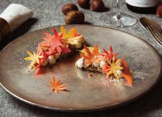 秋は互いに香りや味を高めあう組み合わせとして用いられる’ペアリング’をスイーツとワインで体験。信州の秋を愛でる可憐なスイーツ「栗拾い」では、同じ土地で育った小布施ワイナリーアマローネタイプ2004を合せて。