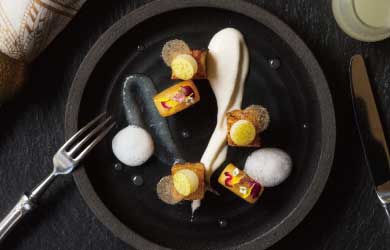 瑞々しい洋梨を存分に活かした1品目は、シャキシャキとした食感も残して軽く焼いた洋梨に、なめらかな洋梨のクリーム、素材を感じるピューレとパリパリとした薄い飴も飾って。こんがりと焼いたブリオッシュと一緒に頂けば、バターと洋梨の芳醇な香りが広がります。
