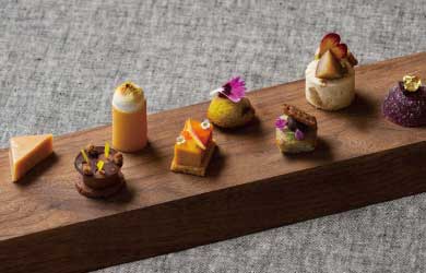 蕎麦や胡桃・山椒など信州ならではの食材を組み合せた、10種類のミニャルディーズ。タルトやキャラメル、フィナンシェなど、ちいさな世界にフランス伝統菓子の技術を集約して、コースのクライマックスを華やかに彩ります。