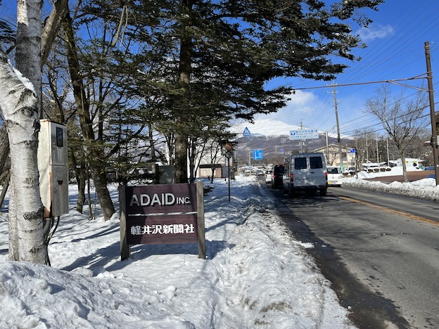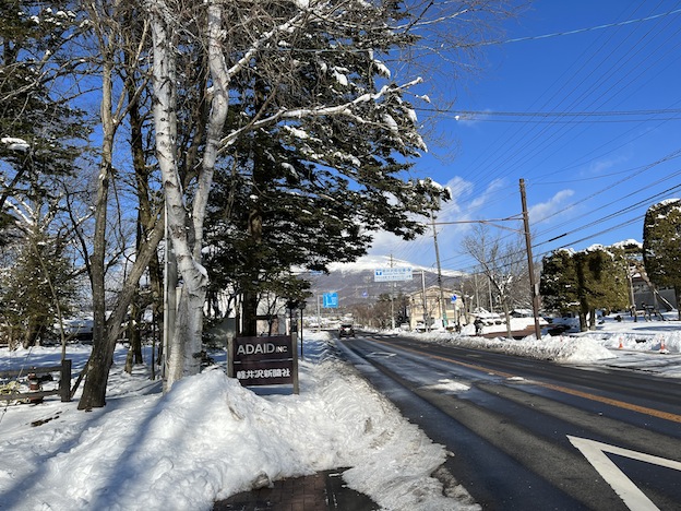 青空が広がり、雪をかぶった浅間山がまぶしいほどに白く反射しています。朝9時の軽井沢の気温は-5.1