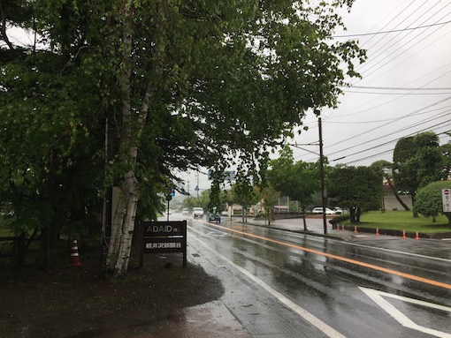 軽井沢は昨晩から降り続いている雨で、道路には大きな水たまりができています。 梅雨前線が関東地方の沿