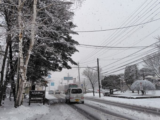 道端には昨日降った雪が残っています。あさ9時の気温は-4.8℃、空全体が雲に覆われています。 き