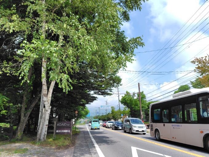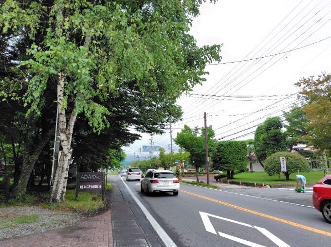 あさ9時の気温は22.5℃。朝方降っていた雨はすでに止んで道路も乾いています。 軽井沢は雨時々曇
