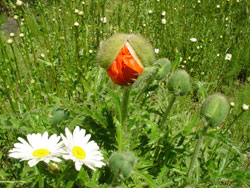 オリエンタルポピーが今年も咲きました。握りこぶしよりも大きく見た目も華やかなので、かなりの存在感。右の写真は、二つに割れて開こうとしているつぼみですが、この段階でマーガレットと比べてもかなり大きいのがお分かりいただけますか?
