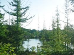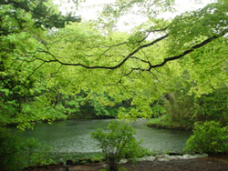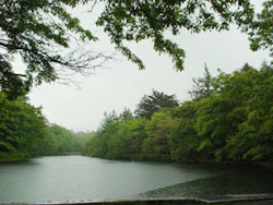 所々青空が見える明るい空から突然の雨、稲光に雷。バシバシ降りだした雨の中、雲場池はしんと静まり返っていました。雨の雲場池もとっても素敵です。
