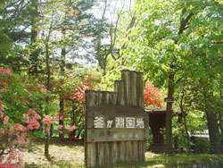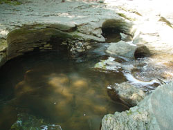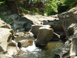 鳥井原から発地に抜ける途中にある釜ヶ淵。3万年程前の浅間山爆発で「古南軽湖」ができ、その滝壺がこの釜ヶ淵付近で、河流浸食により下の写真のような甌穴(おうけつ)ができたそうです。