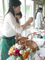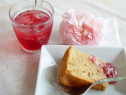 バラの花びらジャム作りの講習会は大人気。バラ園を歩きながら、ジャムに向くバラの選定や種類について説明を聞いた後は、先生お手製のアイスローズティーと紅茶シフォンバラジャム添えをいただきながらレシピの講習。バラの魅力もいろいろと教えていただきました。