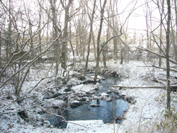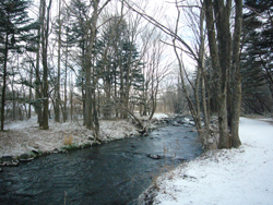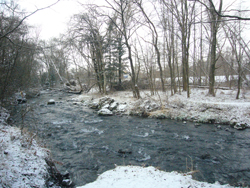 年末年始も寒い日が続き、川の中にも凍りついている部分が!鮮やかな色を失った冬の自然の中で、ぱっと目を引く雪の白ですね!