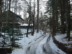 メイン道路からのびる小道はほとんど雪が溶けず白いまま。木々の落した影と白い雪のストライプ模様がきれいです!