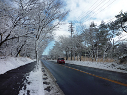 道路上の雪は既に融けてしまっています。ただ一本小道に逸れると、カチカチに凍っているところがあるので運転、歩行ともに注意が必要です。