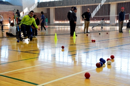 ボッチャとは、2チームが赤・青のボールを目標球と呼ばれる白いボールに向けて6球投げて、