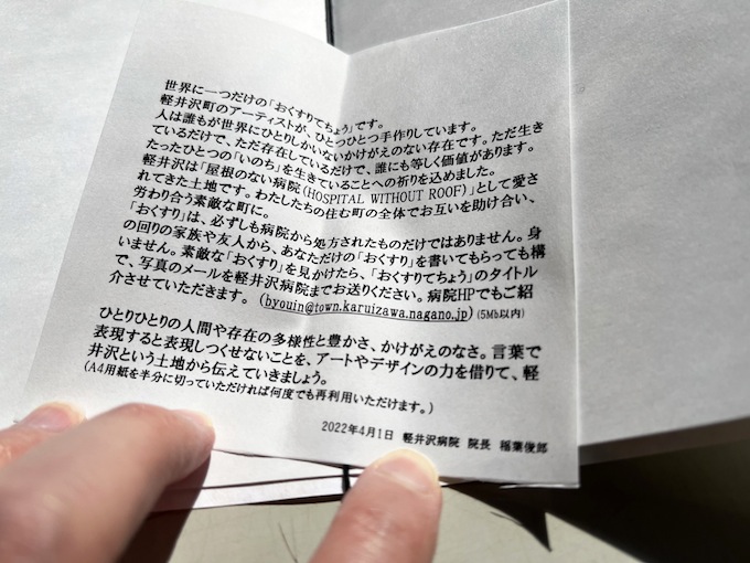 先日、軽井沢病院で配布された世界に一つの「おくすりてちょう」。町内のアトリエ「RATTA RATTARR(ラッタ ラッタル)」のクリエイター(障がい者)による手づくりです。