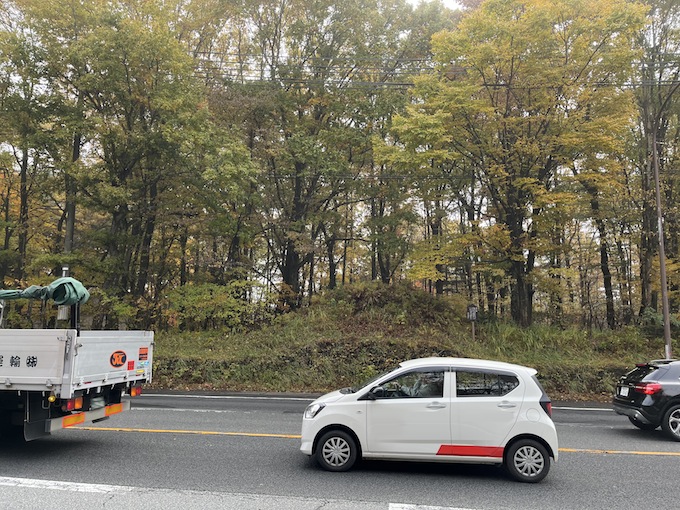 離山通りから国道18号へ。雨宮池の紅葉モミジの下を通過し、軽井沢中学前の信号から線路を渡り旧中山道へ。