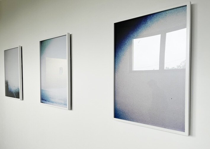 前期の展示タイトルでもある作品「Hello-Goodbye」は、金箔の上に置いた白のアクリル絵の具を剥がし、再び置き直すことで、空間の奥行きと時間経過を表現。印刷した海辺の風景の写真を撮影し、印刷してさらに撮影することを10回繰り返した作品群も展示している。後期は8月10日から9月8日まで。