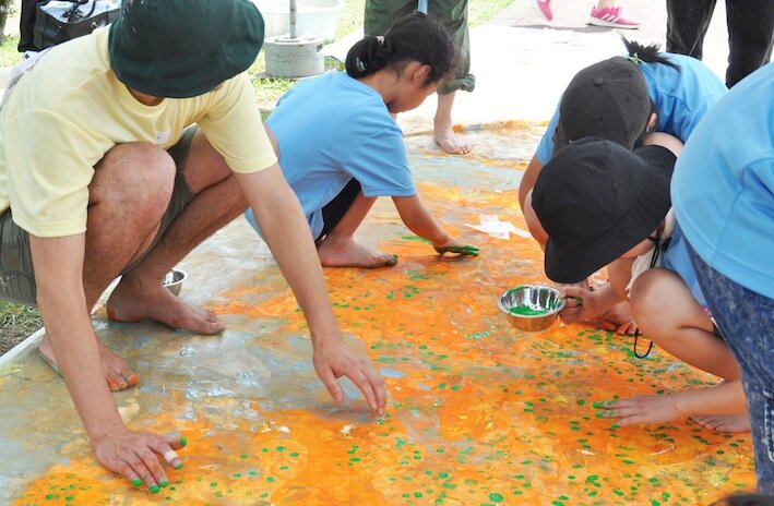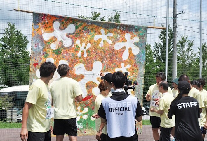 「人間の体」をテーマに、大勢で作品を制作したアート教室。指先や手のひら、足の裏など体全体を使って色づけ。最後にはアスリートが筆入れしました。