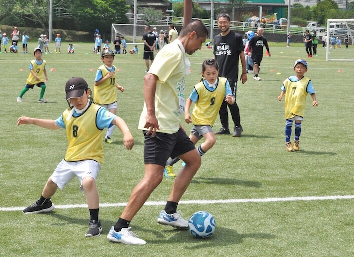 サッカーは初心者と経験者に分かれて活動。経験者組のミニゲームで、坪井慶介さんは「ボールを持ってないときに、周りをよく見ることが大事」とアドバイス。