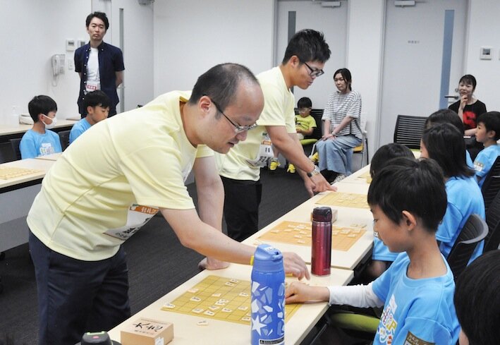将棋教室では、渡辺明さんと戸辺誠さんが15人の小中学生を相手に多面指し。渡辺さんが「まいったな」と考え込む場面も。