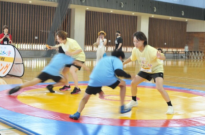レスリング教室では、ともに五輪金メダリストの登坂絵莉さん、土性沙羅さんが一人ずつタックルを受け、激しい当たりに登坂さんは「ナイスタックル。すばらしい」。