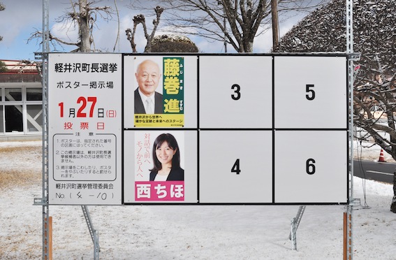 軽井沢は現新一騎打ちとなった、選挙戦の真っただ中。 両陣営の選挙カーが、会社前を行き交っています。