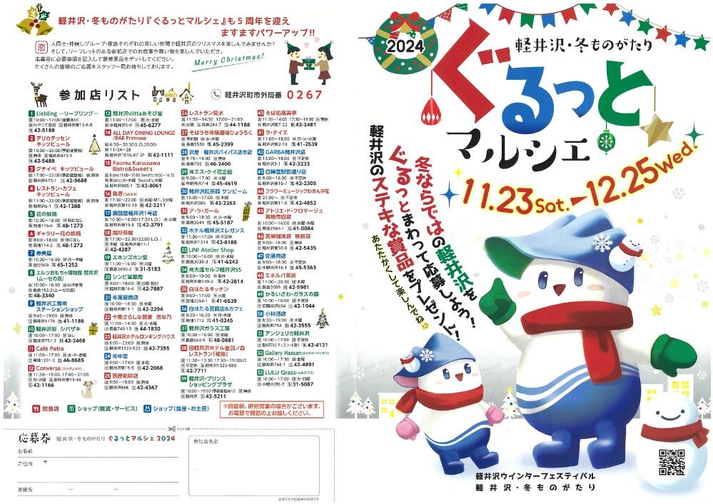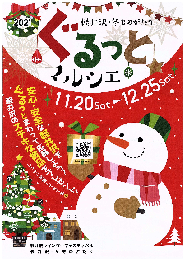 ウインターフェスティバル ぐるっとマルシェ 2024/11/23(土)~ 2024/12/25(水) 町内各登録店舗 期間中、参加店舗で1000円以上利用するとプチプレゼントが貰える。 さらに抽選で豪華プレゼントが当たる。 TEL.0267-41-3850 イベント詳細 開催日2024/11/23(土)~ 2024/12/25(水) 場所町内各登録店舗