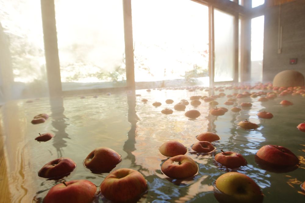 星野温泉 トンボの湯での「りんご湯」や、りんごの形を模したテントで味わう限定スイーツ、ハルニレテラスでのワークショップを通じて、見て、浸かって、味わって、りんごを五感で楽しめる。