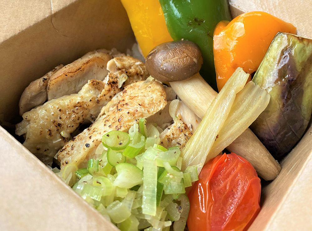 群馬ブランド赤城鶏の旨味を生かしたテイクアウトメニュー。赤城鶏モモ肉をセロリ風味で軽く煮込み葱ソースを沿えた、ごはんのすすむ一品です。