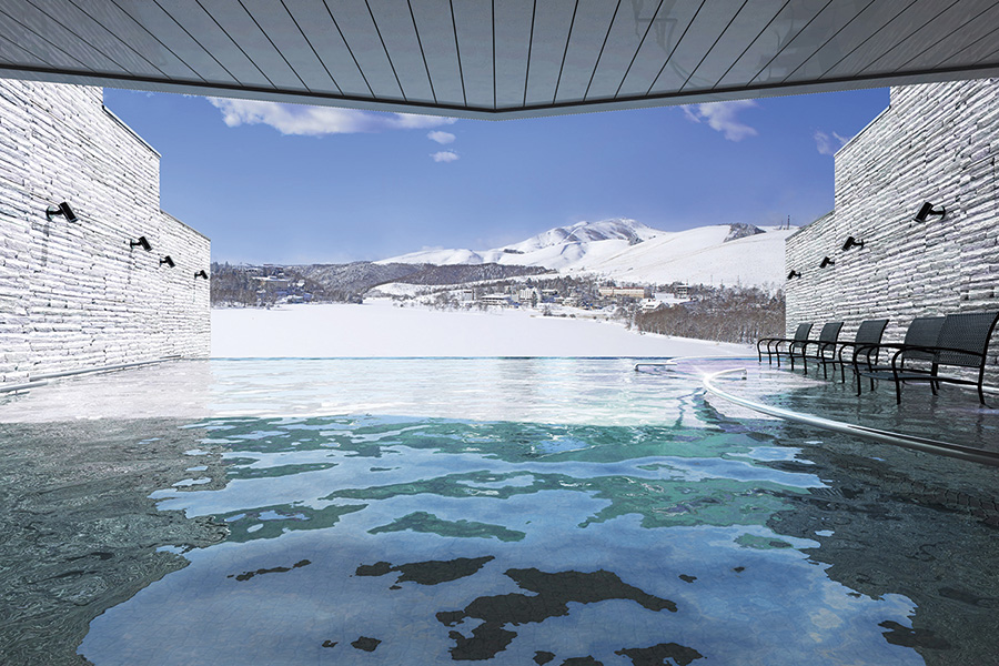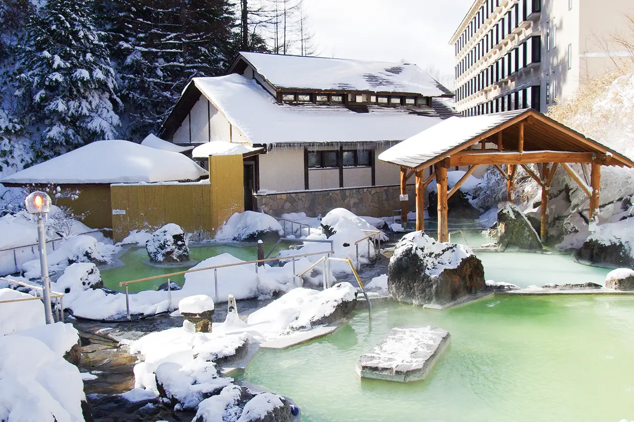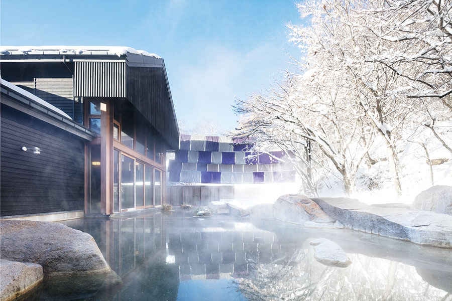 日本有数の大露天風呂。森林に囲まれた大きな湯船に浸かれば、日々の疲れも癒やされる。冬は雪見でゆったりと。