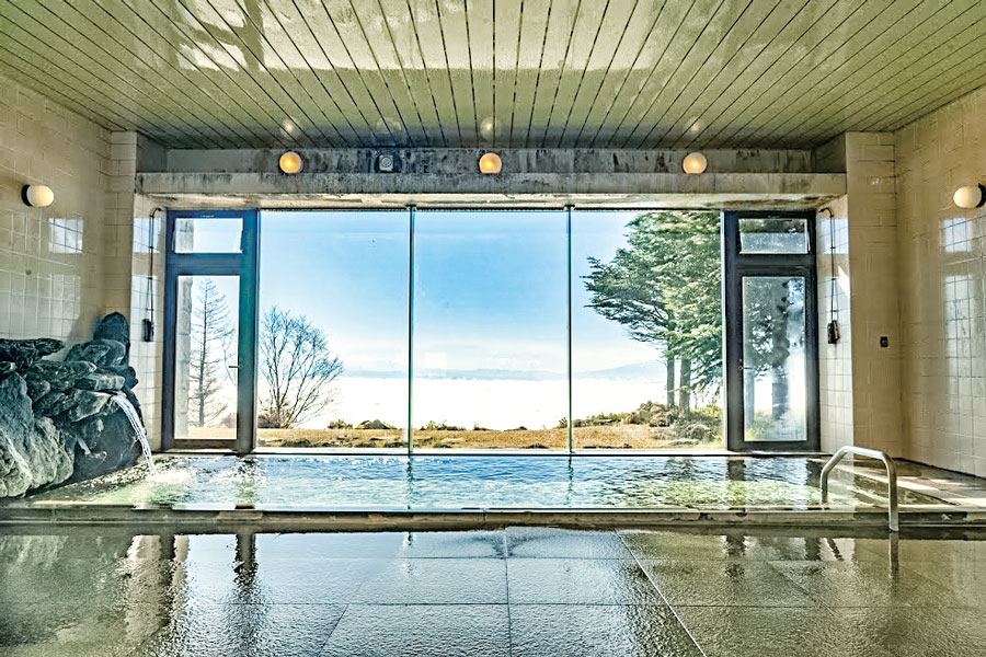 八ヶ岳連峰を望む絶景と天然温泉が自慢。食事処、岩盤浴、トレーニングルームなどを備える複合施設。