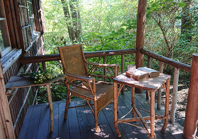 A.C.ショーが建てた軽井沢の別荘第一号「ショーハウス」は「前期軽井沢バンガロー」と称されますが、ベランダはありませんでした。「後期軽井沢バンガロー」になると、雨や霧をしのぐベランダが付くようになります。欧米人はこのベランダでティータイムをとる習慣があり、庭と部屋をつなぐベランダは社交の場にもなり、玄関としても利用されることもありました。今も別荘建築には必ずと言っていいほど、ベランダを取り入れています。野鳥のさえずりを楽しみながら朝食をとったり、籐椅子を置いて読書したり、夜は友人たちとバーベキューで集ったり、軽井沢の別荘ライフにベランダは欠かせないものとなっています。