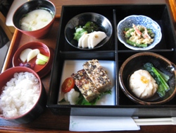 2週間ごとに内容は替わりますが、本日の内容は、ひき肉と竹の子のみそ松風、やわらか蟹しんじょの煮物、長芋とワカメの梅酢和えそして、いんげんと卵の胡麻和えでした。松風焼きは竹の子の食感もよく、焼き焦げた感じが芳しい。しんじょは、蟹の味がそのまま生かされ、なめらかな舌ざわり。どちらも手間をかけたお料理に愛情を感じました。