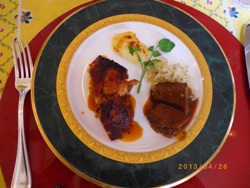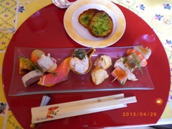 右から:海の幸のバルサミコ酢風味、海老の湯葉巻き揚げ、エスカルゴ、生ハムパパイヤ、鴨肉と鶏のテリーヌ、なんと、ゴージャスでしょう!