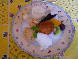 右から フルーツ盛り合わせ、ガトーショコラ、クッキー、ヨーグルト・シャーベット、シナモンのアイスクリーム、オペラ、苺のムースケーキ、白ゴマのブラマンジェ。