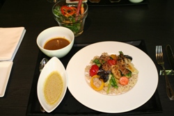 こちらは2種類のルーを楽しめる野菜カレー。左奥にあるのはキビを発酵させて作ったきび味噌が隠し味の和風カレー。手前はグリーンカレーです。ほとんどが無農薬・無化学肥料の、12~13種類の旬の野菜をいただけます。お米は発芽玄米、こちらにもオーガニックサラダがつきます。