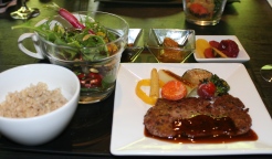 、サラダの奥に隠れてしまっているのは香味海苔のお味噌汁です。メインのハンバーグはなんとレンコンから作られています! お米も食物酵素を摂取できる酵素玄米です。