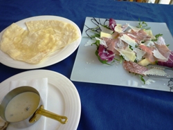 北イタリアでは家庭料理としてポピュラーなピアディーナ。柔らかめに焼いたピッツァの生地に、生ハムやサラミ、ルッコラ、洋梨をのせ、ゴルゴンゾーラチーズをかけて巻いていただきます。一般的なピッツアより低カロリーでヘルシー。軽いので、いくらでも食べられそう。ランチはパスタ、パン、コーヒー付きのランチ。