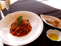 友人が選んだ「季節野菜のトマト煮込み ラグーソーススパゲッティ プロシュートをのせて」。