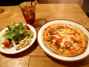 友人がオーダーしたのは、熱々チーズとたっぷりのフレッシュトマトのマルゲリータ。チキンが苦手な人のためにと、ピザランチも用意してあるそう。セットのサラダも野菜たっぷりで食べごたえがあります。